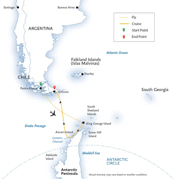 Take the fastest route to Antarctica – a three-hour flight – and enjoy your first glimpse of the continent from the air, a unique introduction to the vast and dramatic landscape that remains one of the last unspoiled regions in the world. Continue your journey on ship, where an adventure beyond your wildest imagination awaits. Later, return through the world’s most legendary – and exciting – passage of water, as you follow the path of historic explorers across the infamous Drake Passage. Expect the unexpected and be rewarded with unique wildlife and natural attractions, each highlight surpassing the last. Marvel at the contrast of a desolate landscape inhabited by abundant wildlife including curious, playful penguins and seals. And embrace the excitement of standing on the continent for the very first time.