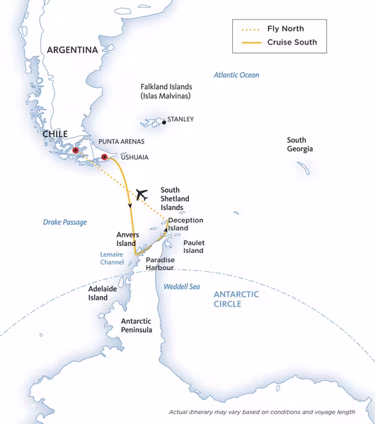 Revel in the excitement of crossing the famed Drake Passage after embarking from Ushuaia, with the convenience of a northbound return flight at the end of your expedition. Minke and humpback whales or Adélie penguins floating on ice floes may greet you as you travel to the northernmost tip of the Antarctic Peninsula.