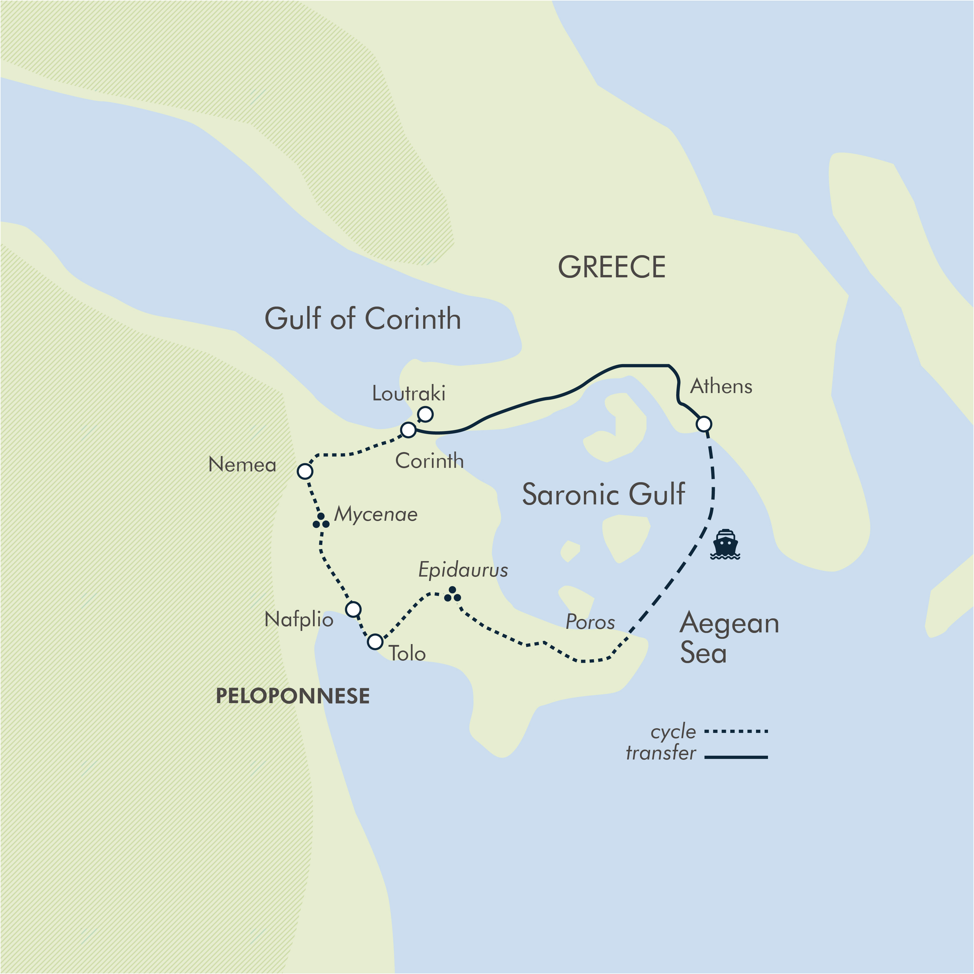 For history, archaeology and mythology, the Peloponnese is arguably the most interesting part of Greece. Our week of cycling is a journey through fascinating classical history and a superb variety of landscapes, from the azure blue sea to the green olive trees and vineyards of the heart of Greece. Starting and finishing in Athens, the ride offers plenty of opportunities to discover some of the country’s treasures, such as Poros island and the beautiful town of Nafplio. Each day gives us the chance to sample excellent local food in various restaurants and tavernas and immerse ourselves in the Greek culture and lifestyle.