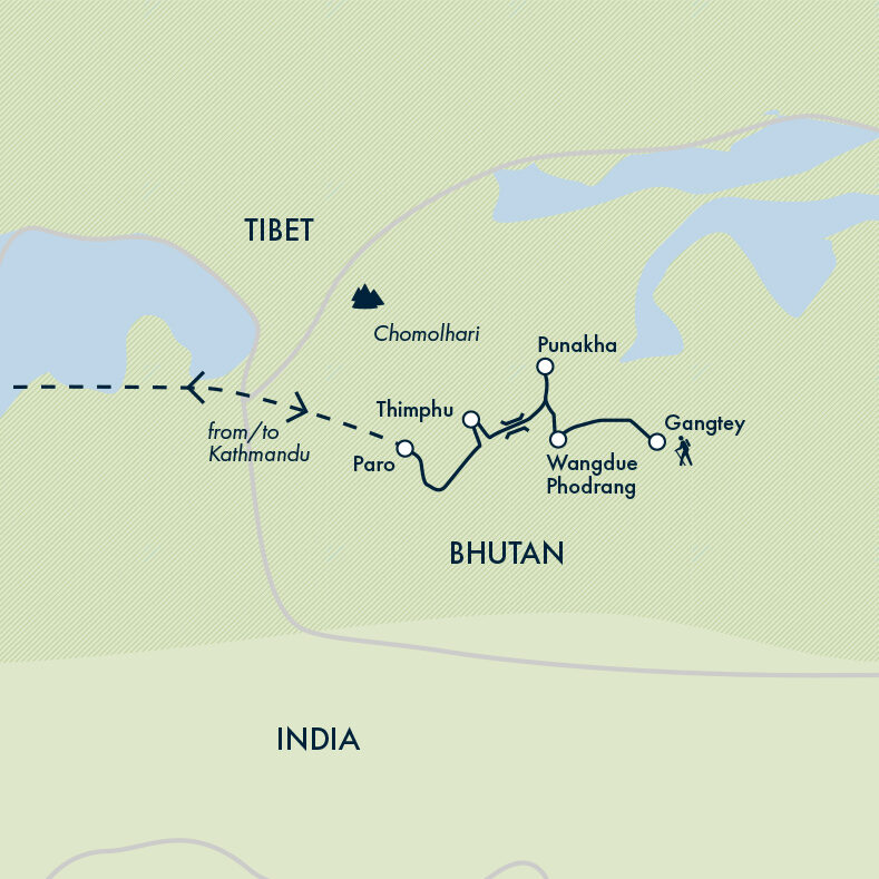 We leave Thimphu in the morning and drive east to Gangtey. The route climbs steadily on a good road to the Dochula Pass, where there are 108 chortens (Buddhist shrines).