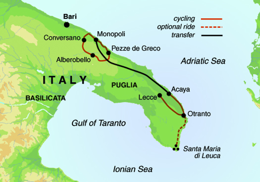 This self-guided, ten-night cycling holiday explores Italy's beautiful, sun-drenched Puglia region with its vibrant fishing villages, sandy beaches and beautiful, rolling hills, all above the mesmerising blue of the Adriatic Sea.