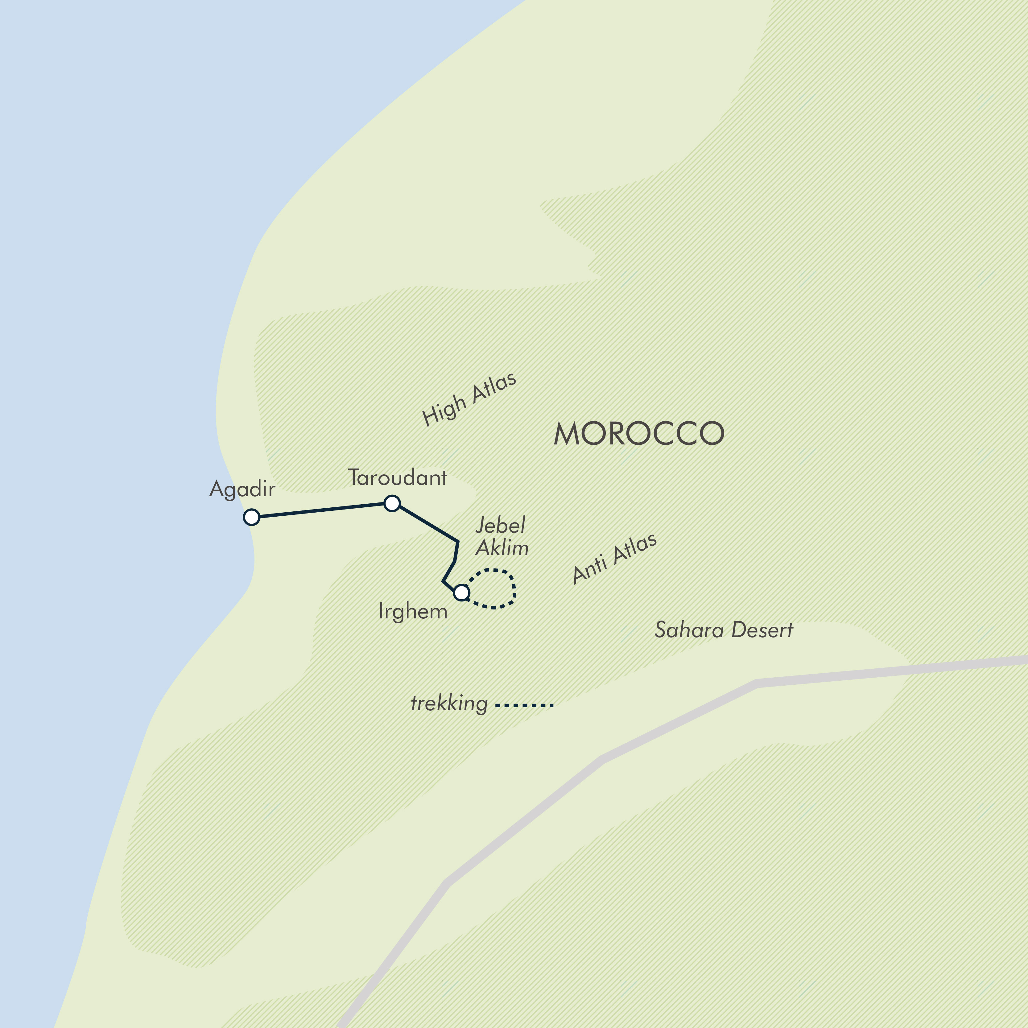 The adventure begins in Agadir, a coastal city at the foothills of the Anti-Atlas Mountains.