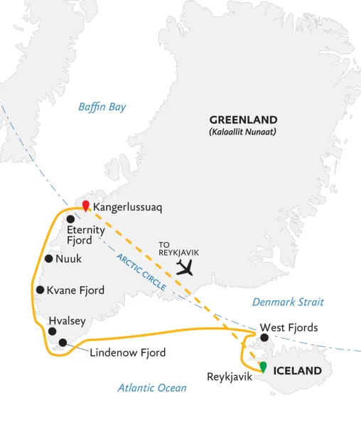 - All meals while on the ship - Beer and house wine during dinner - All accommodation - All transport and listed activities - Tour leader throughout and qualified Expedition Staff - Mandatory transfer package including charter flights from Kangerlussuaq, Greenland to Reykjavik, Iceland