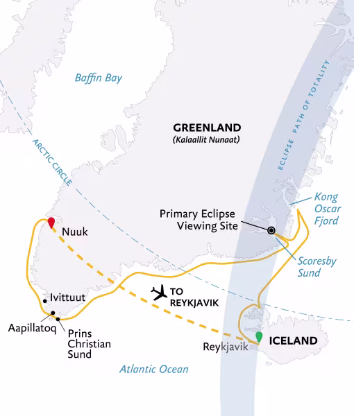 To satisfy the demand of eclipse-watchers, this longer voyage has been introduced on one of Quark's newest ships, Ocean Explorer. Covering 2,200 nautical miles in total—this expedition features your bucket-list eclipse adventure, time to explore Northeast and South Greenland, plus you get to check off two of the world’s northernmost capital cities: the Icelandic capital of Reykjavik (64°08′ north), where you’ll have time to explore, and Nuuk, Greenland (64°11′ north), where we disembark for our charter flight back to Reykjavik.