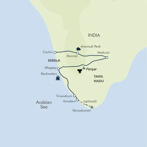 Discover the laidback side of India with a cultural adventure in the tropical south. Over two weeks, we explore the distinct states of Kerala and Tamil Nadu, finding idyllic coastlines, spirituality, lush mountains and culture-rich cities. The highlights are plenty: discover the verdant Munnar tea plantations, meet local people on an immersive village walk and cruise the serene backwaters of Kerala on a traditional converted rice barge. It ends with a relaxing stay on the old hippie trail beach town of Kovalam.