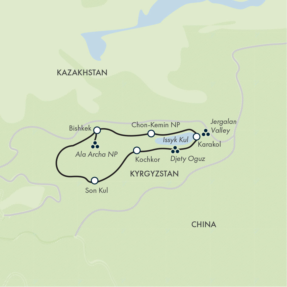 Starting from the capital, Bishkek, we head into the wild and walk among marvels of nature, including the Tian Shan mountains, Ala-Archa Gorge, and alpine lakes, such as Issyk Kul and Son-Kul. We also experience the nomadic traditions of the country, staying in a lakeside yurt camp, before returning to Bishkek with a scenic drive over mountain passes.