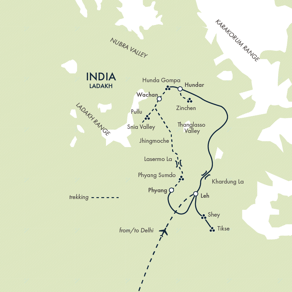 Concealed by the Ladakh and Karakorum mountains, the Nubra Valley in northern India remains unseen and untouched by mass tourism. Here, rare double-humped Bactrian camels share a near-unspoiled terrain with traditional shepherd camps and elusive snow leopards. To reach it, we must take a spectacular flight over the Himalaya to Leh, the largest city in the Ladakh region, before crossing the Khardung La, one of the highest drivable passes in the world and a one-time route for Silk Road traders. It’s then into the wilderness, exploring the virtually uninhabited Nubra Valley on foot while gazing at unnamed peaks and camping wild as we go.