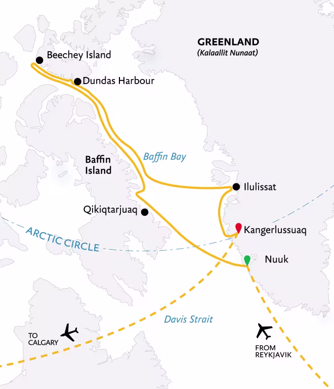 - All meals while on the ship - Beer and house wine during dinner - All accommodation - All transport and listed activities - Full complement of qualified Expedition Staff - Mandatory transfer package including charter flights Reykjavik to Nuuk and Kangerlussuaq to Calgary