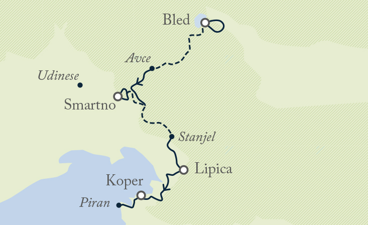 From the turquoise waters of Lake Bled and the white peaks of Julian Alps to the emerald Soča river and green Karst vineyard, finishing at the blue Adriatic Sea. Cycle through traditional villages around Lake Bled before taking a scenic railway journey to Avče from where you'll reach Goriška Brda, the 'Tuscany' of Slovenia. Explore the local vines and wines before discovering the Karst region and visiting the hilltop village of Štanjel, a medieval stonemason settlement with narrow, stone alleys that wind among the buildings built on terraces and the UNESCO-listed Škocjan caves. Next stop is Lipica, home of the original Lipizzaner horses with the stud farm dating from 1580 to the time of the Hapsburg. It is possible to join a guided tour to see the horses before cycling on to the edge of the border with Italy for views out to the coast towards Trieste in Italy and your destination. the city of Koper. A scenic path takes you along the Parenzana railway line to Koper from where you cycle on to Piran - looking back to the distant mountains gives you a great feeling of achievement.