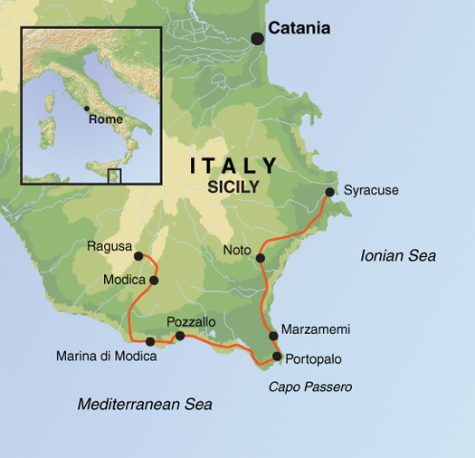Your journey takes you along a mix of inland and coastal routes, starting amidst the Baroque splendour of Ragusa and Modica and ending in stunning Siracusa on the east coast. You'll cycle through lush valleys filled with olive trees, almond groves, vineyards and citrus orchards and patchwork puzzles of dry-stone-wall farms, as you cycle between UNESCO World Heritage Sites rebuilt in the typical late Baroque style after the famous 1693 earthquake.