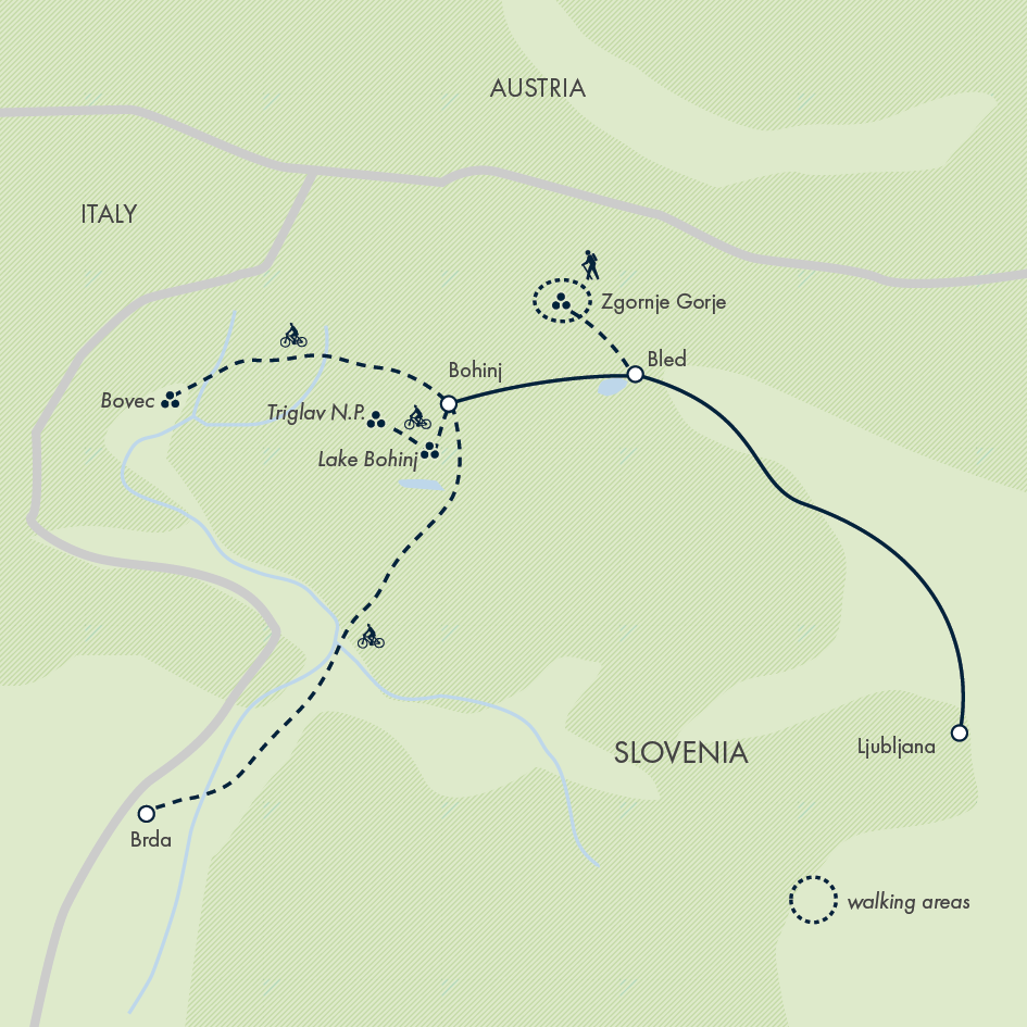 Switch to two wheels today, pedalling about 18mi (30km) along a mix of gravel and paved trails that loop around Lake Bohinj. Our route includes stops to appreciate the canyons, caves and cascades shaped by the Bohinjka river over centuries.