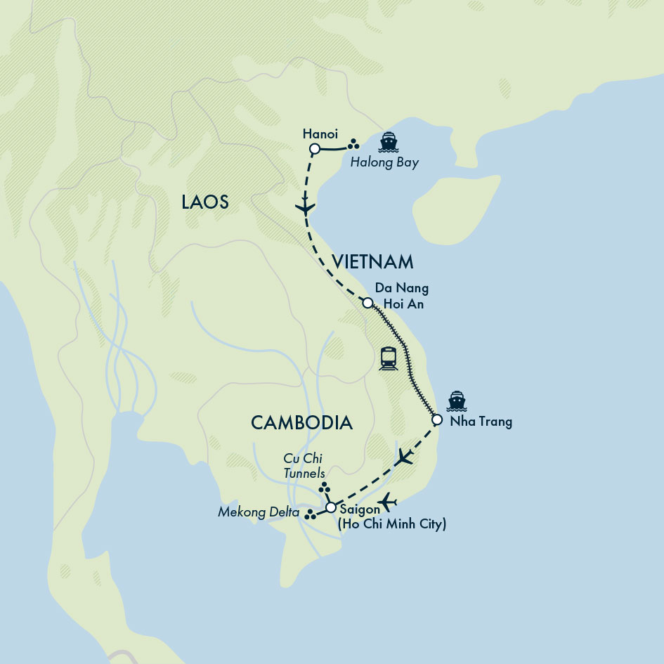 - Accommodation: 2 Superior nights (hotel), 9 Classic nights (8 hotel/resort, 1 Ha Long Bay boat), 2 Simple nights (sleeper train and homestay) - 13 days of sightseeing, boat trips, kayaking and exploration - Travel by private minibus, boat, bike, train and two internal flights - Group normally 8 to 24, plus leader. Minimum age: 9
