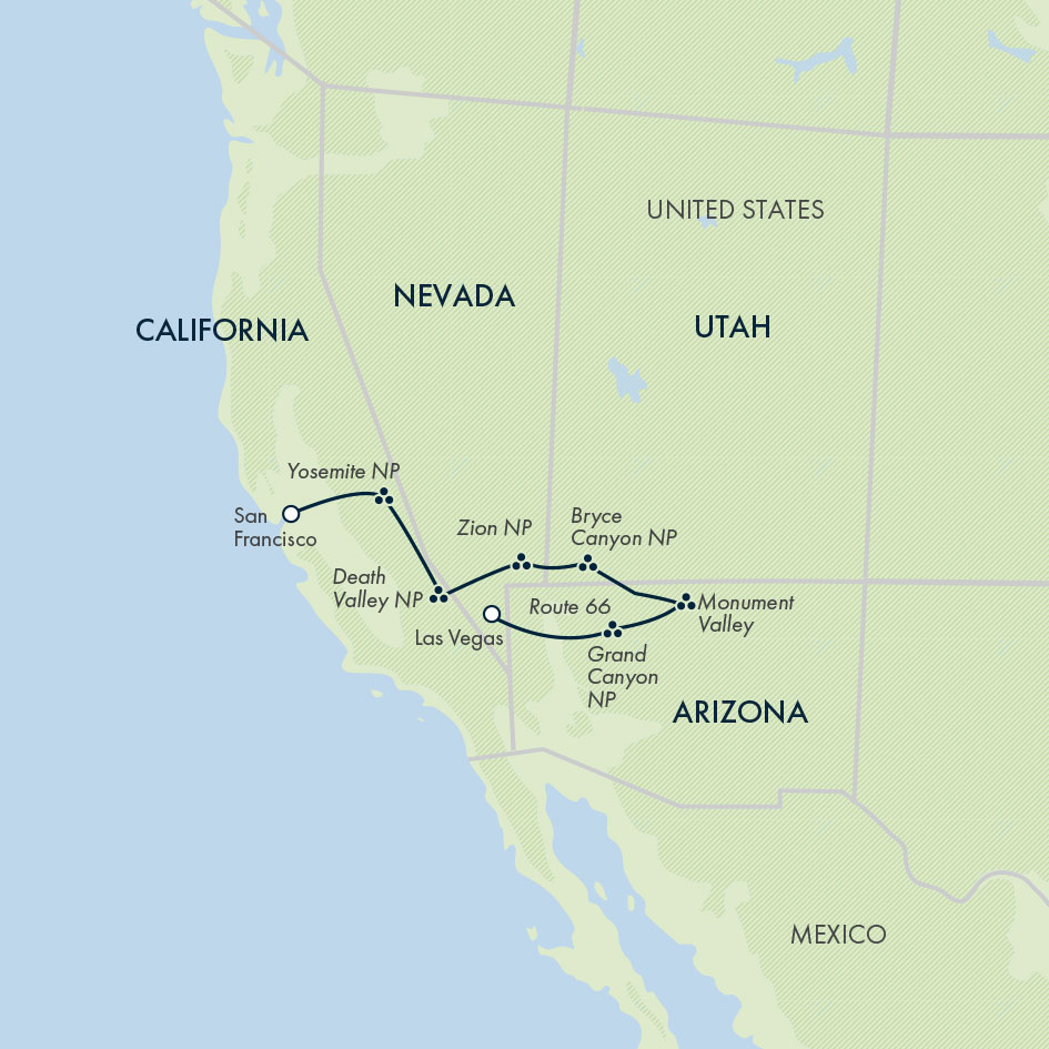 A medley of human-made and natural wonders are on full display on this popular tour of western USA. Yosemite Valley and the Grand Canyon are rivalled only by the power and beauty of the Navajo’s sacred Monument Valley. Hike under the largest sandstone cliffs in the world at Zion Canyon, observe strange landscapes in Death Valley, and gaze upon the ever-changing colours of Bryce Canyon. There’s adventure around every corner in the most geographically diverse region of the United States.