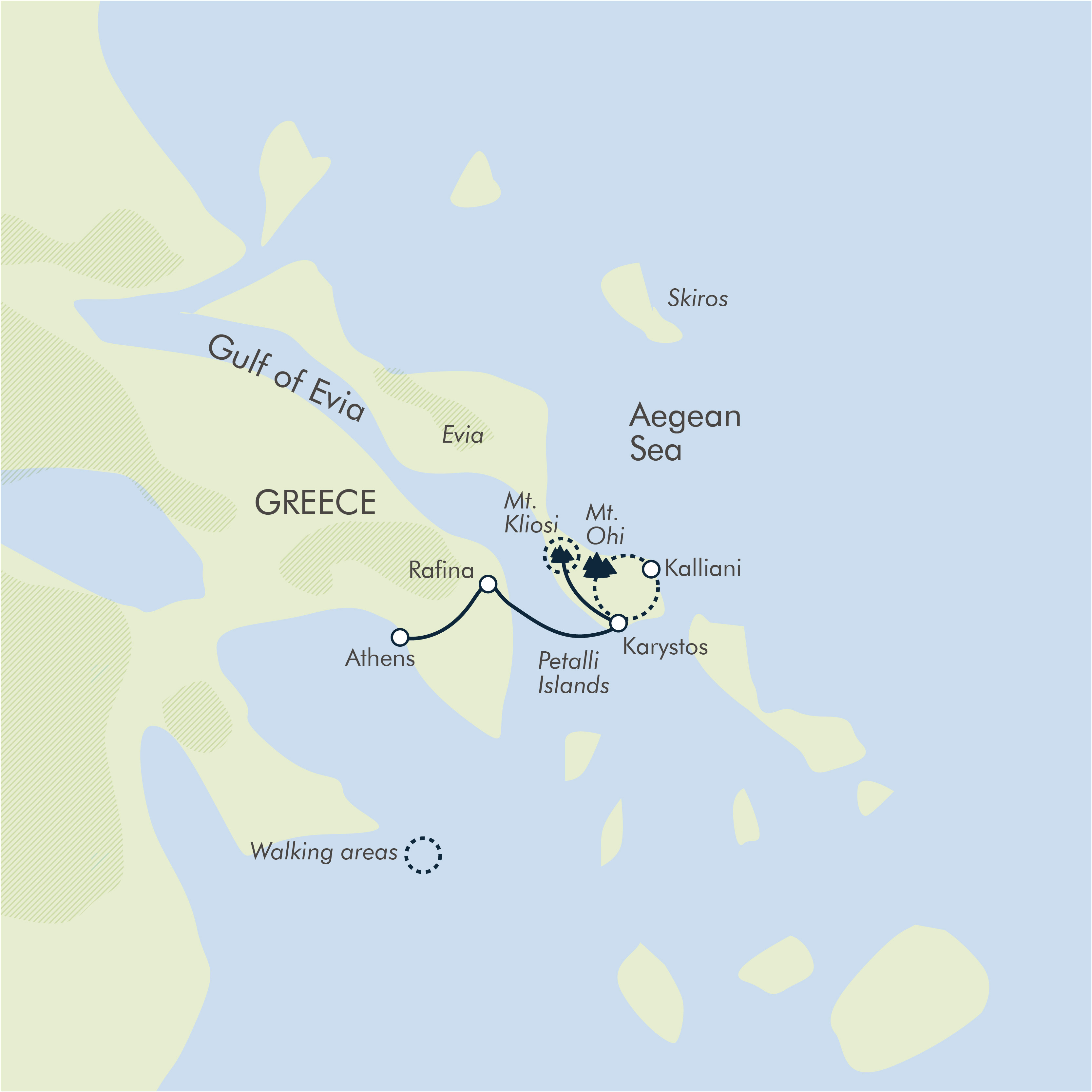 Our adventure begins at Athens airport. From here we transfer by road to Rafina (approximately 35 minutes) and then take the ferry to Mamari on Evia Island (about one hour). It is a 20-minute drive to our hotel in Karystos.
